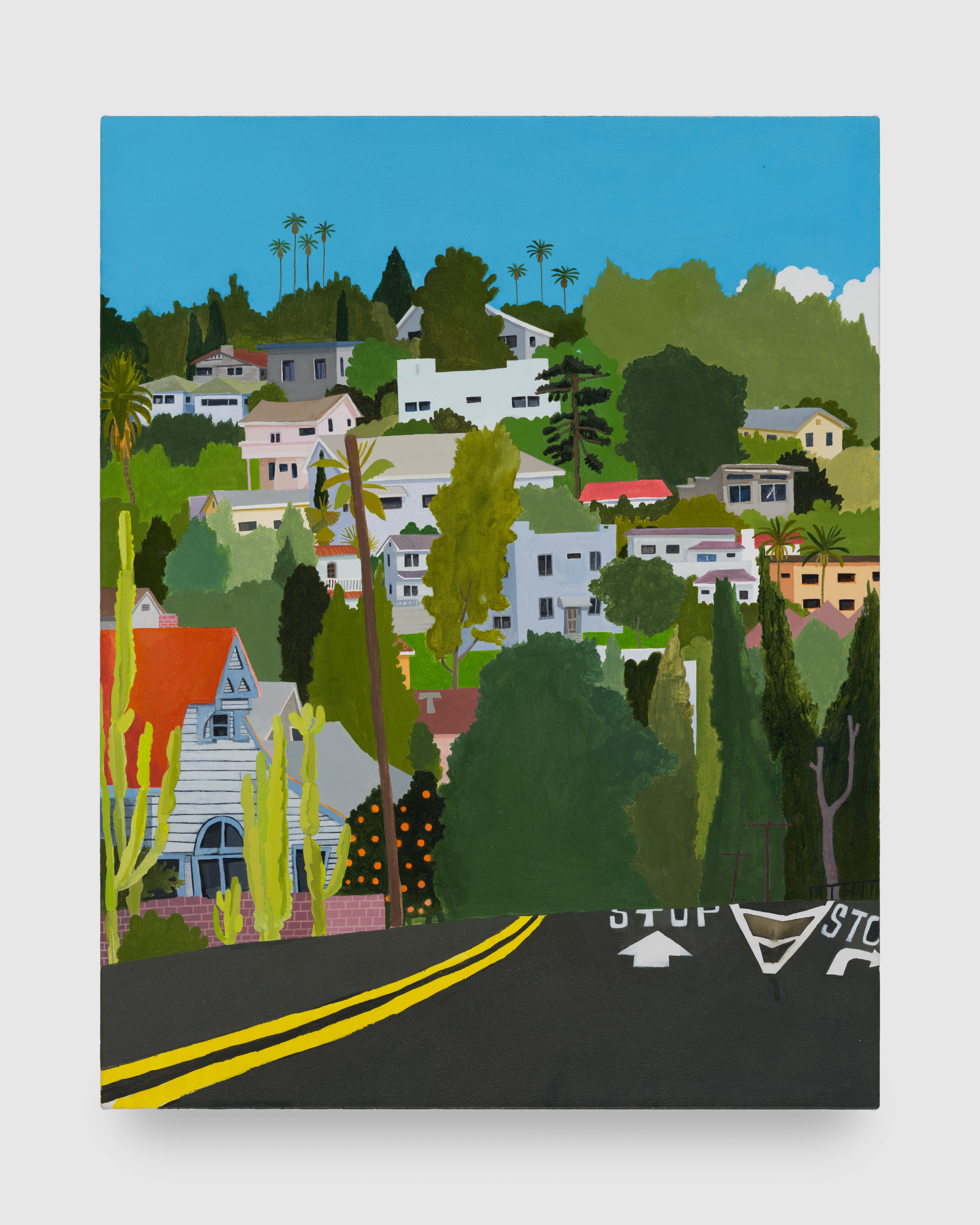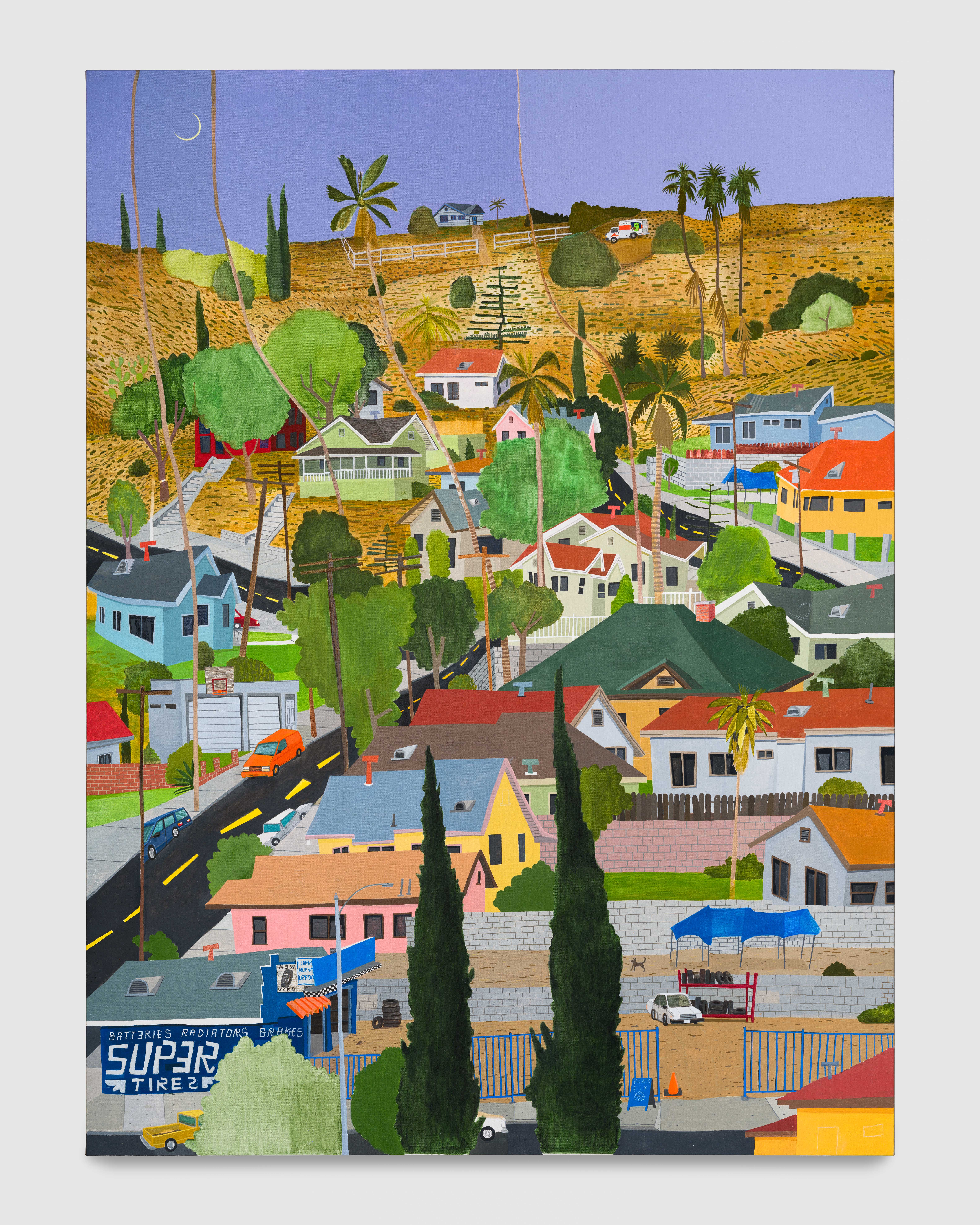 Manuel López, a native of Los Angeles, California, is among those artists who summon the mundane to be re-presented as something new, as an act of creation; to look at the same things differently, with a changed gaze. In other words, he unfolds everyday life as a means of making art. The presence of the landscape of his native city and its interaction with Latin culture, more precisely Mexican culture, is evident in much of his work. Streets set on hills and lined with palm trees across nearly their entire length, along with the names of those neighborhoods in the captions, insistently remind us—almost like a quiet confidence shared between viewer and artist—that we are in Los Angeles.