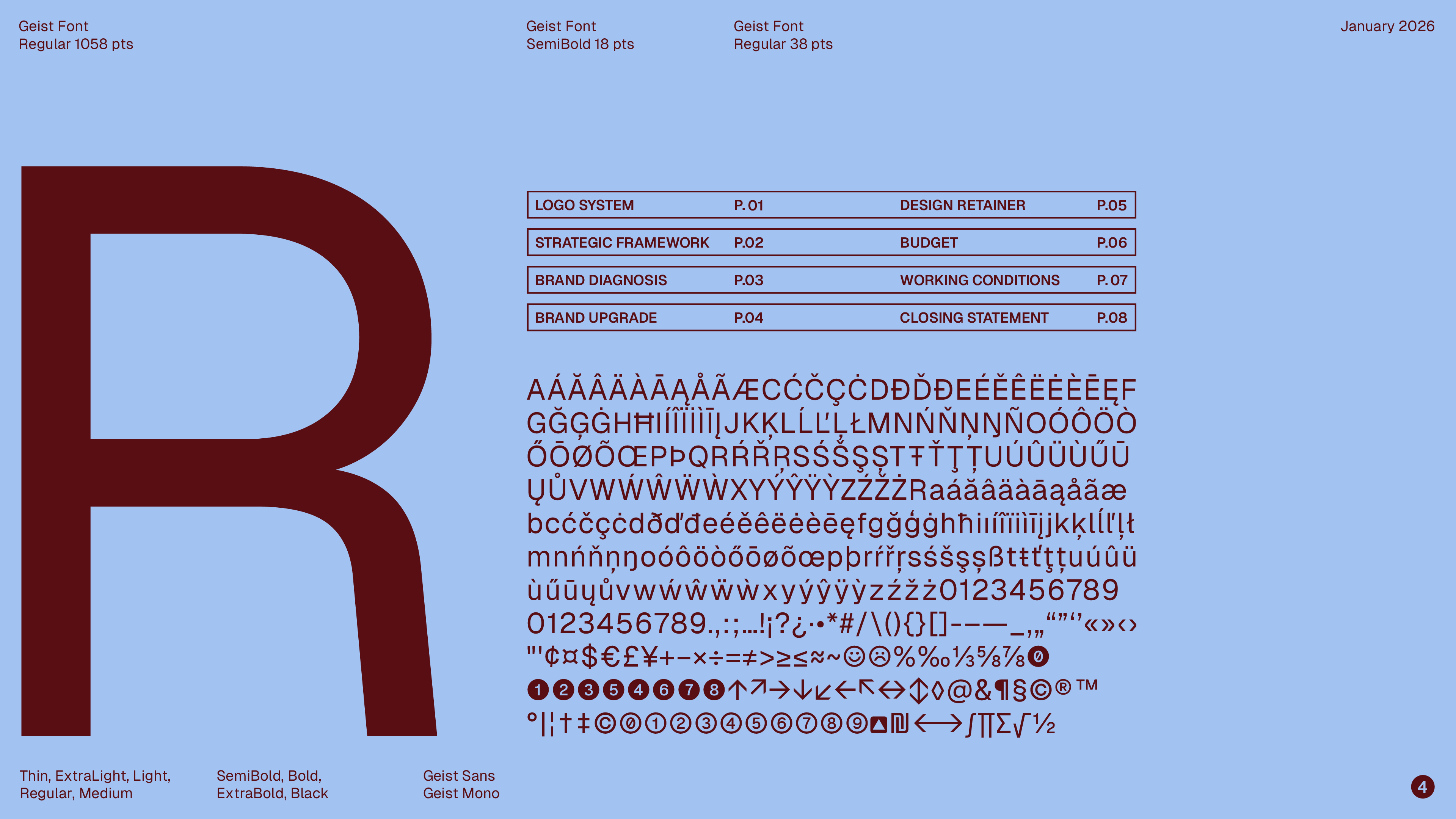 Geist Sans ships with nine weights (Thin through Black), a substantial glyph inventory, and multiple stylistic sets. The uppercase “R” in Geist Sans stays faithful to the neo-grotesque tradition, with a balanced, restrained construction. The vertical stem is straight and uniform in thickness, while the upper bowl—closed and semicircular—joins the stem at the top with a smooth, continuous curve, without abrupt breaks.